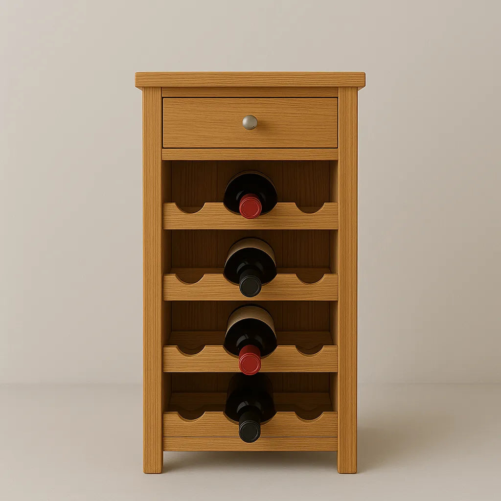 Enhance a small dining area with the compact wine cabinet designed to save space. This unit holds up to twelve bottles in four open racks, offering easy access and neat display. A top drawer provides a place for tool or napkin. With a slim profile, the cabinet fits into a corner or a narrow gap. The light finish and rounded edges create a gentle presence, blending into dining or kitchen setting. Suitable for a modern setup where storage meet clean design.