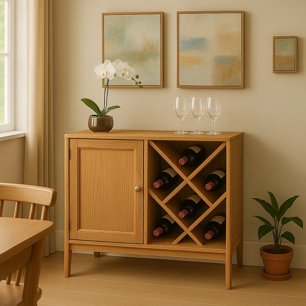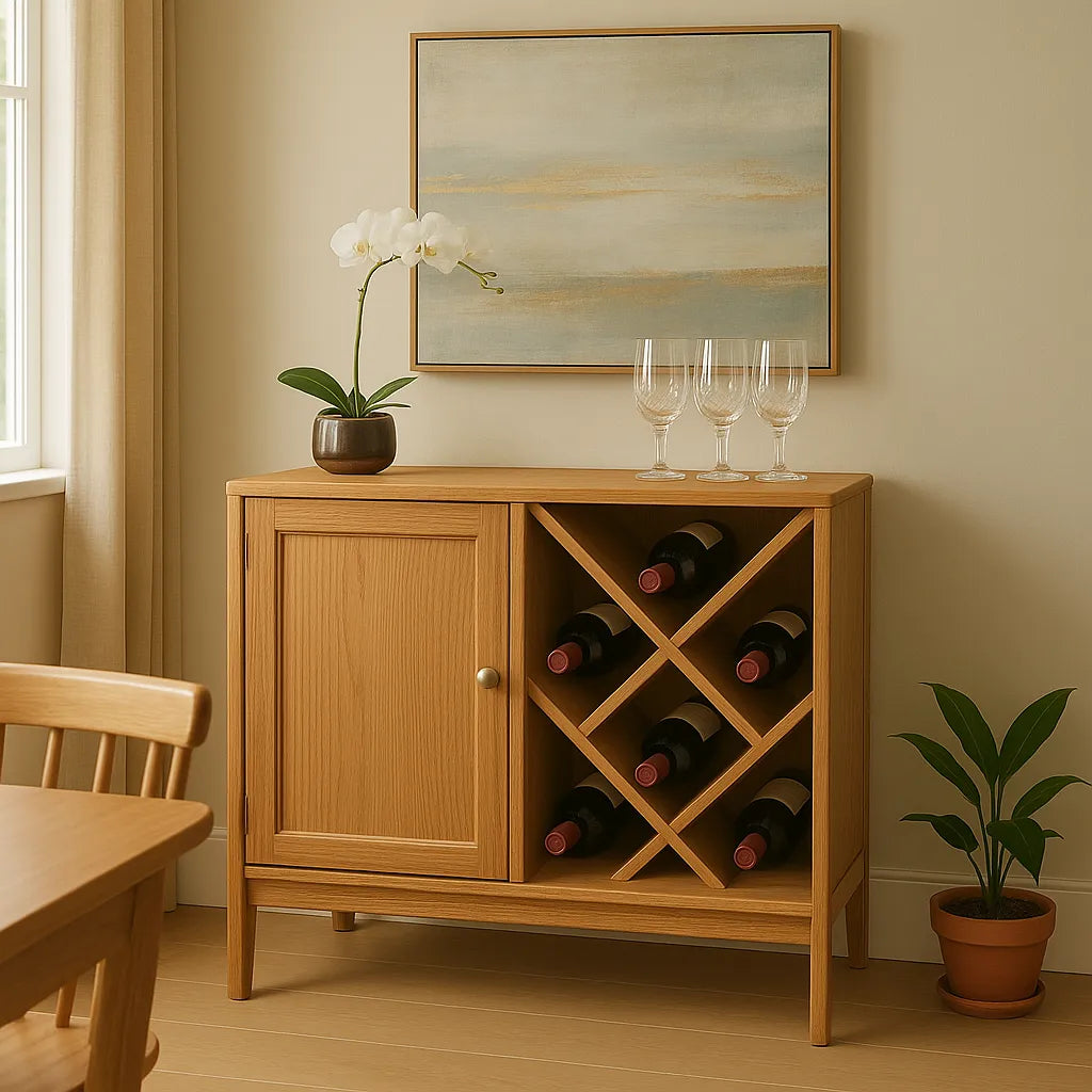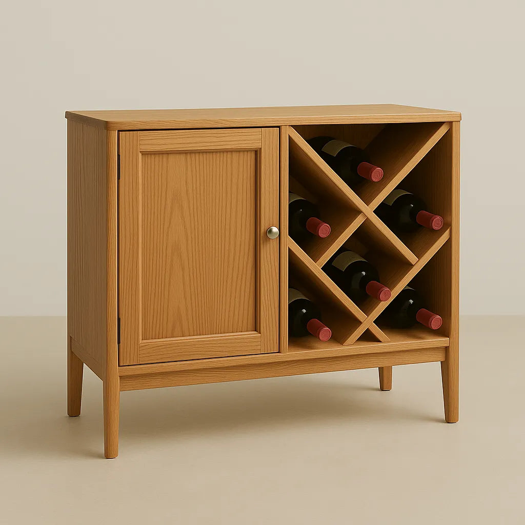 Diamond wine cabinet brings a structured look to bottle storage with its distinct X shaped shelf design. Created for those who value symmetry and visual order, the open cubby holds each bottle in a diamond layout. A side compartment with a hinged door offers enclosed space for a glass or wine accessory. With a natural finish and well-balanced shape, the cabinet fits into a classic or minimalist setting. Whether placed for daily use or quiet enjoyment, this piece helps keep a wine collection arranged with care.