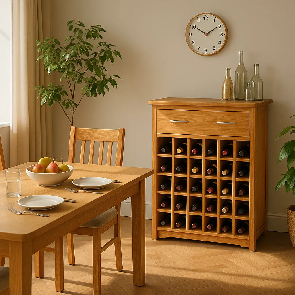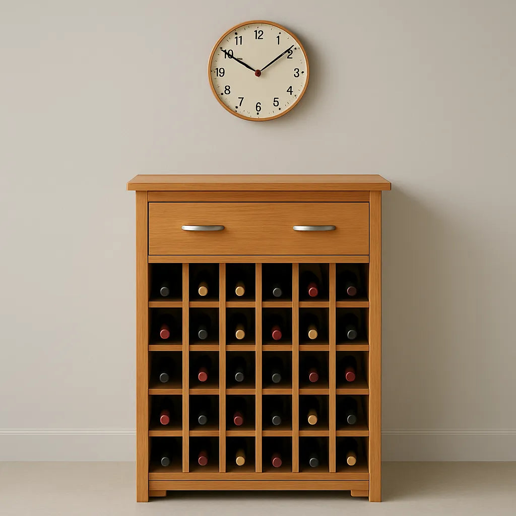 Keep a bottle organized with the Grid Wine Cabinet that stores a collection neatly. This space efficient unit features a structured layout of twenty five open slot, giving each bottle a secure place. A full width drawer above offers room for a tool, coaster, or linen, keeping an essential within easy reach. Its sturdy form, soft finish, and timeless shape make it a natural fit in a dining room, kitchen, or casual bar. The grid wine cabinet is perfect for a collector who values clean display and everyday functionality. Whether hosting a friend or storing a curated selection, this piece delivers simplicity, order, and quiet charm.