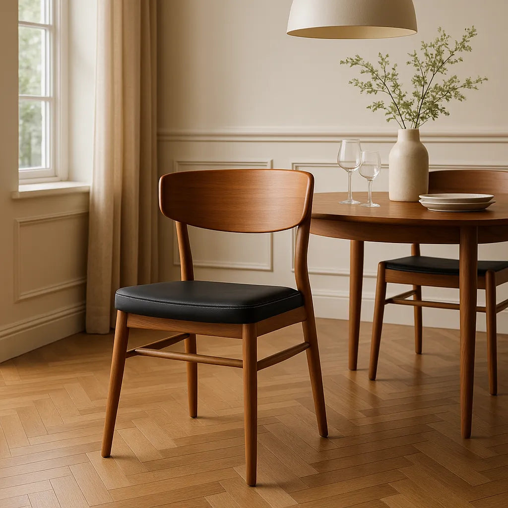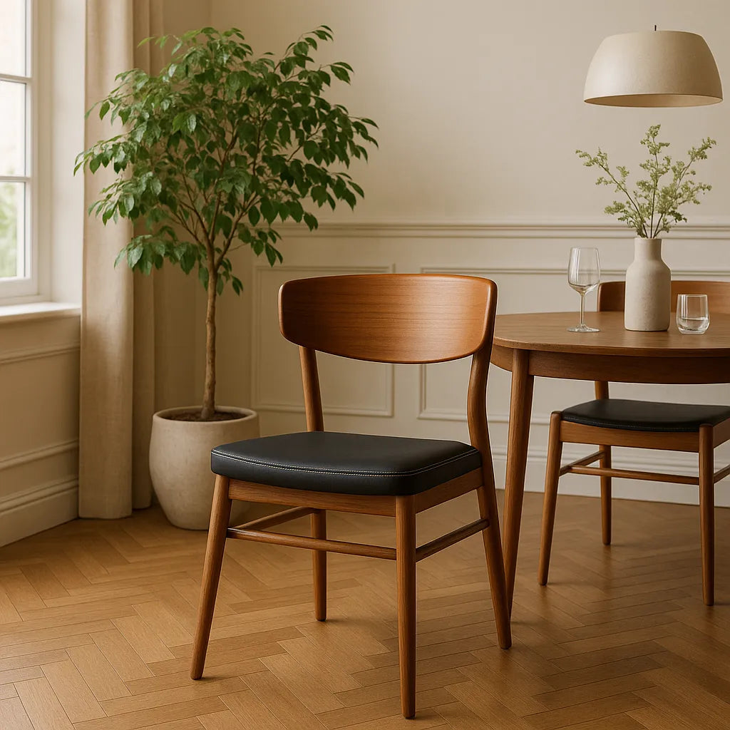 Upgrade a dining space with the mid century dining chair, a fusion of retro charm and modern refinement. Designed with a wide curved backrest and cushioned seat, this chair supports comfort for an everyday meal or formal gathering. Sleek line and warm toned frame add timeless appeal, while a black seat cushion introduces bold contrast that fits both classic and modern interior. The chair structure offers stability, making it stylish and suitable for long term use. Whether placed beside a dining table or used as an accent in a living area, it brings a sense of balance and quiet sophistication. A compact footprint makes it fitting for an apartment or cozy dining nook without taking away from style. The mid century dining chair serves as a versatile piece that shapes the interior with refined proportion and practical design.