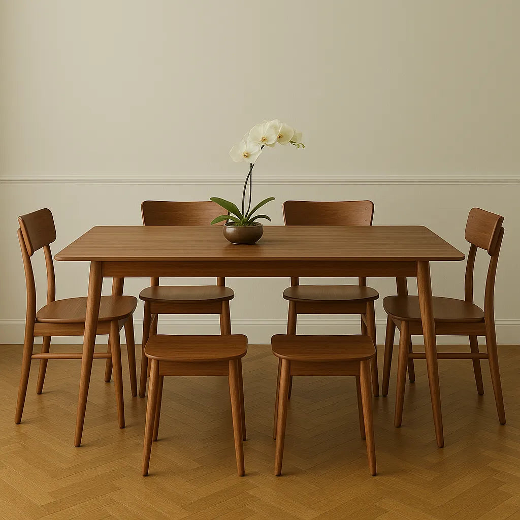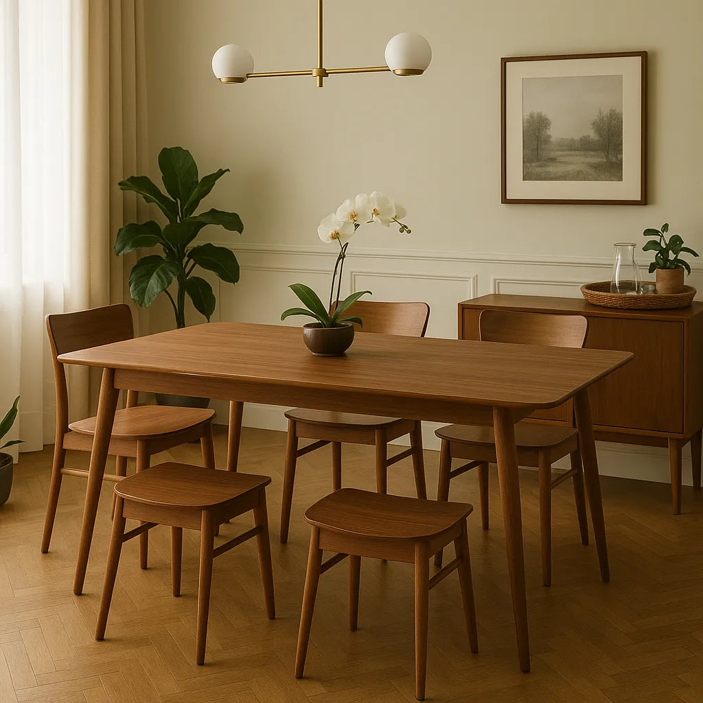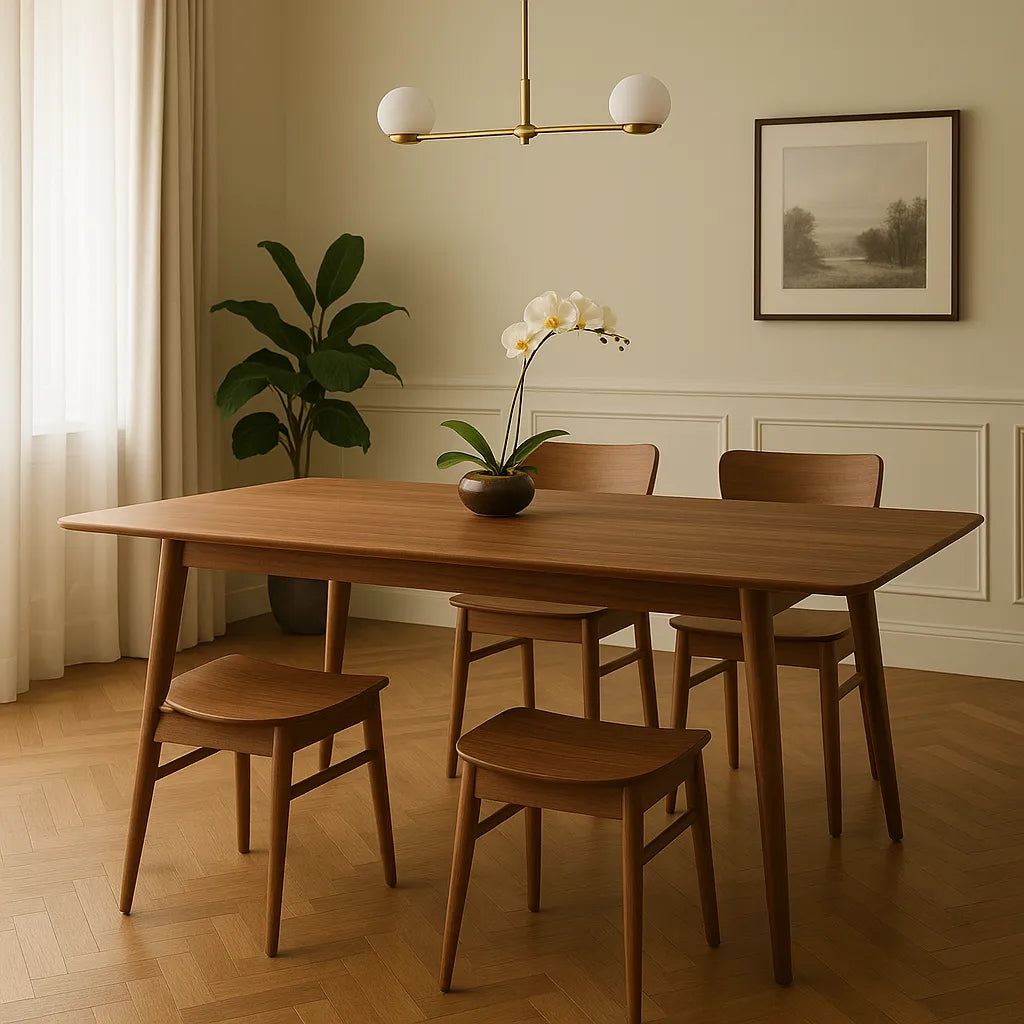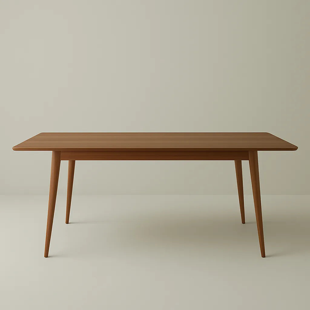 Celebrate simple form with this mid century dining table featuring tapered leg and rounded edge that reflect a classic design approach. The long surface provides space for a shared meal, quiet work or relaxed coffee time. A warm finish and clean structure allow it to blend into retro or modern interior settings. With a light visual presence and steady build, the table becomes a calm point in a dining space. Paired with a matching seat or mixed chair style, it supports connection and brings a gentle rhythm to daily life. Designed to seat up to six guest in comfort.