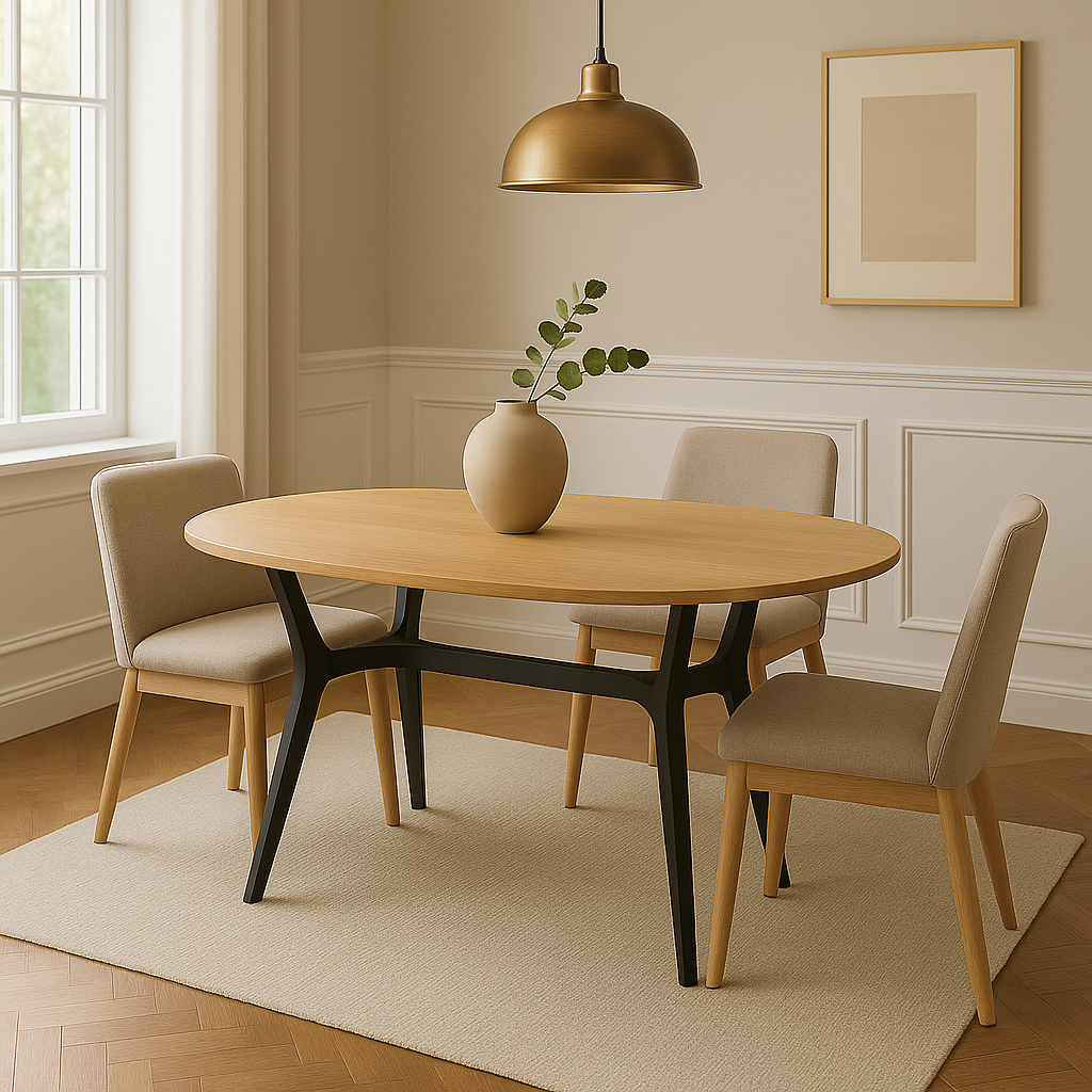 Create a striking focal point in the dining area with this oval modern table featuring a curved top and dark leg for strong visual contrast. The soft shape supports natural movement and relaxed gathering, whether during a quiet breakfast or evening meal. A metal base adds structure with a sculptural form that complements a clean design. Suitable for an open plan layout or a room with gentle lines, this table brings balance and presence without excess. Paired with a simple seat or cushioned chair, it sets the tone for a warm and modern dining experience. Designed to seat four to six guest in comfort.
