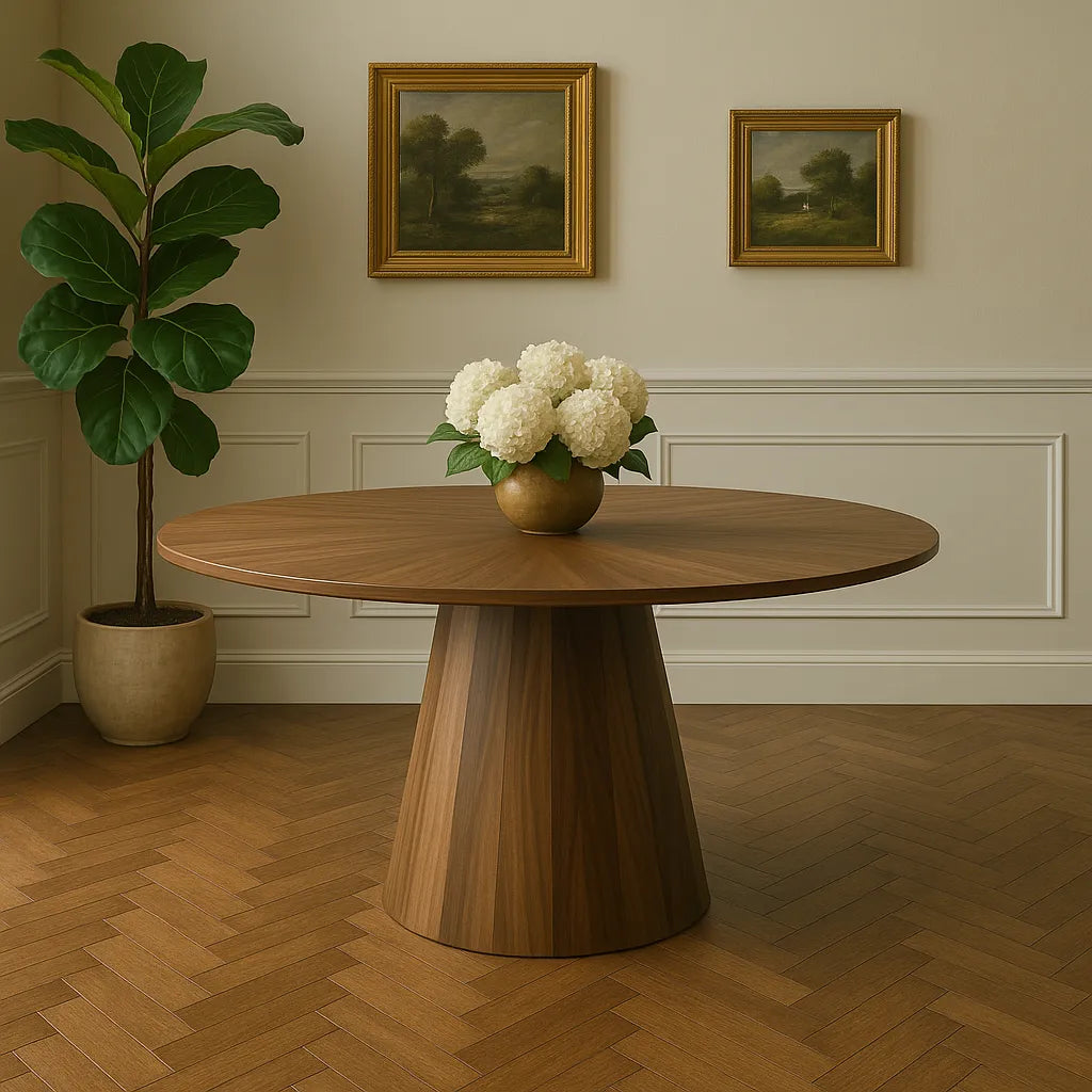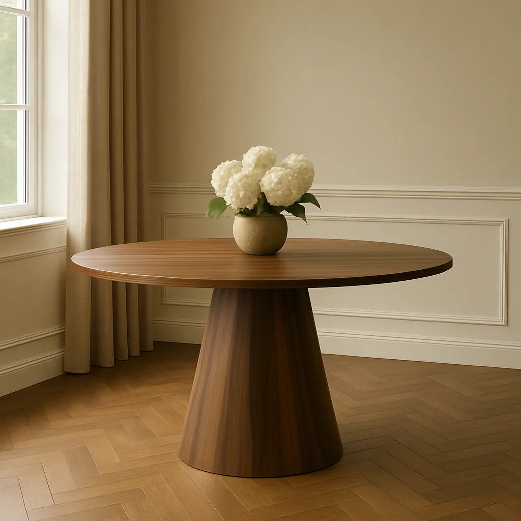 Dramatic elegance defines the space with the sculptural round dining table that commands attention. This table features a bold cone-shaped pedestal base and a smooth circular top, offering a blend of form and function. A deep tone and architectural shape create a strong visual point in modern or transitional interior. The round surface encourages easy conversation and gentle flow, fitting for an intimate meal or daily use. A tapered base supports the structure while adding a gallery-like presence. Suitable for a refined dining room or design-focused apartment, this sculptural round dining table turns the everyday setting into something distinct. A statement for those who lean toward timeless shape with a contemporary note.