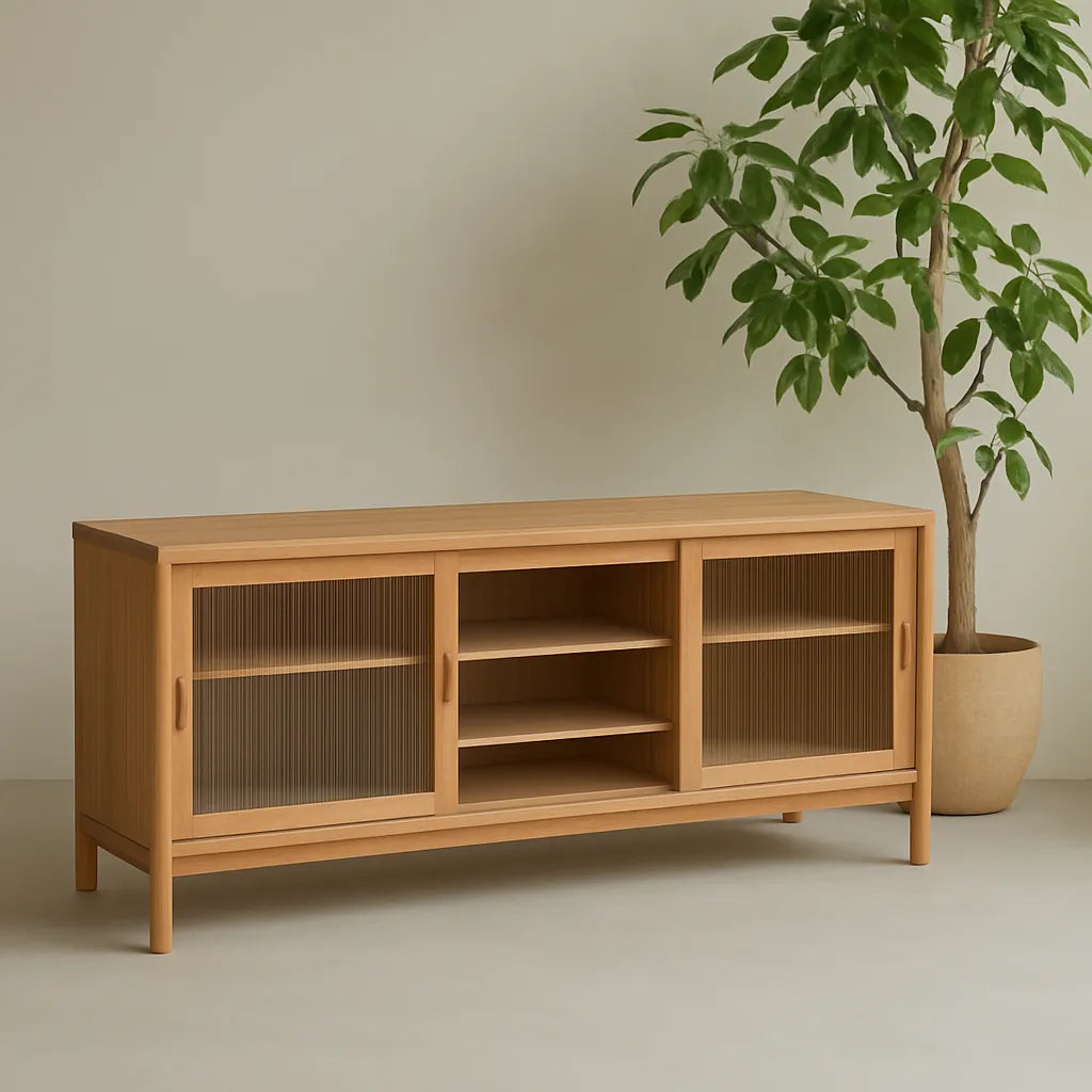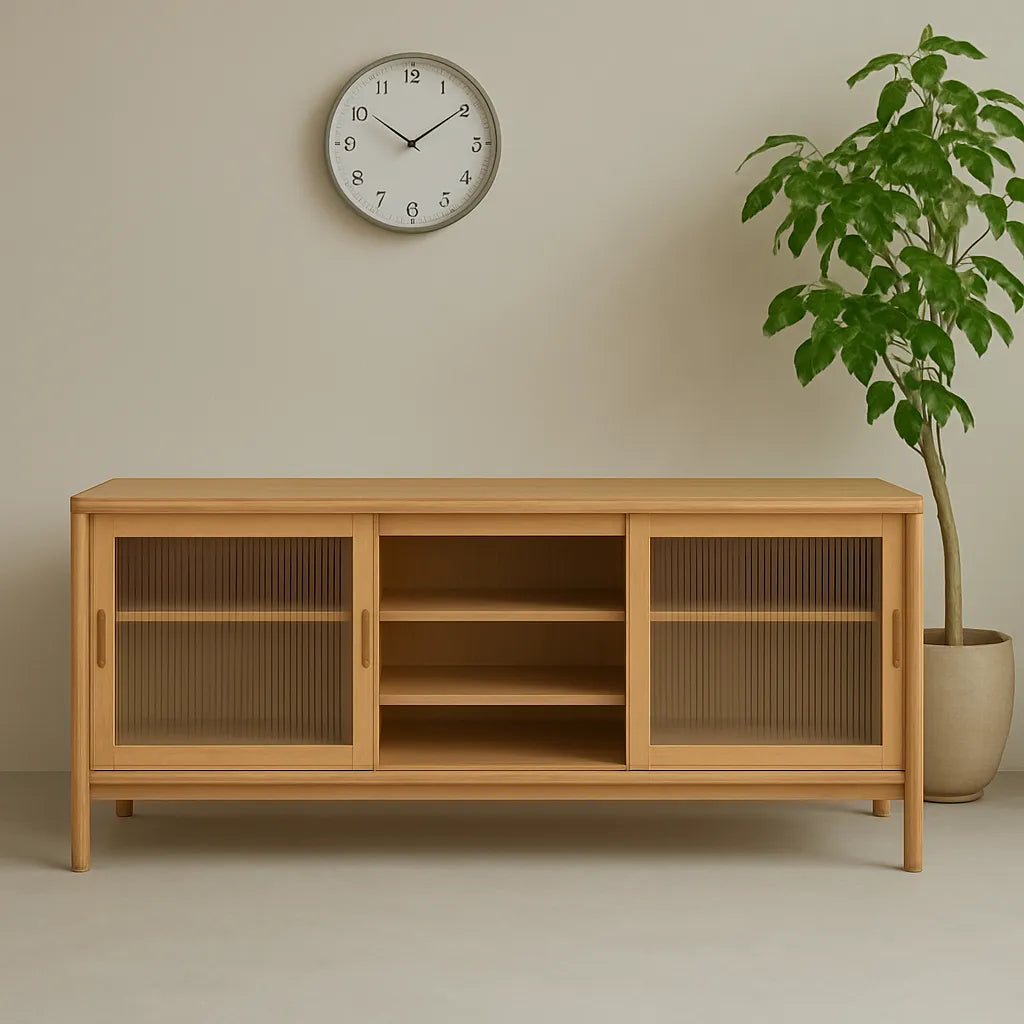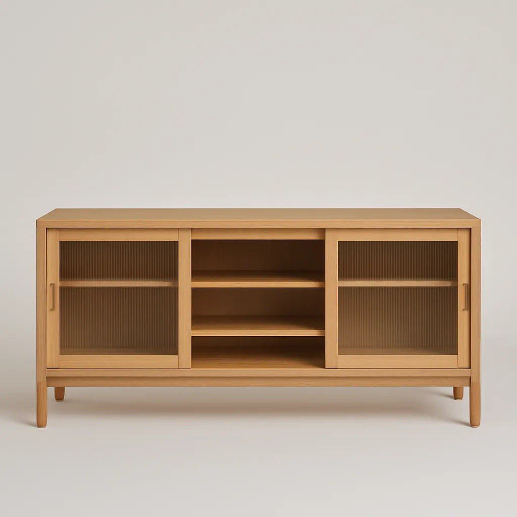 Create a tidy and open feel in the kitchen or dining space with this sliding door cabinet designed with a simple, modern frame. The structure includes two fluted glass doors that slide to reveal an adjustable shelf for plate, glass or pantry item. A central open compartment allows quick placement of a frequently used object or a decorative touch. The low design and clear lines bring a sense of order while supporting daily storage needs. Suitable for an open kitchen, compact interior or relaxed dining area, this cabinet blends function with understated form.