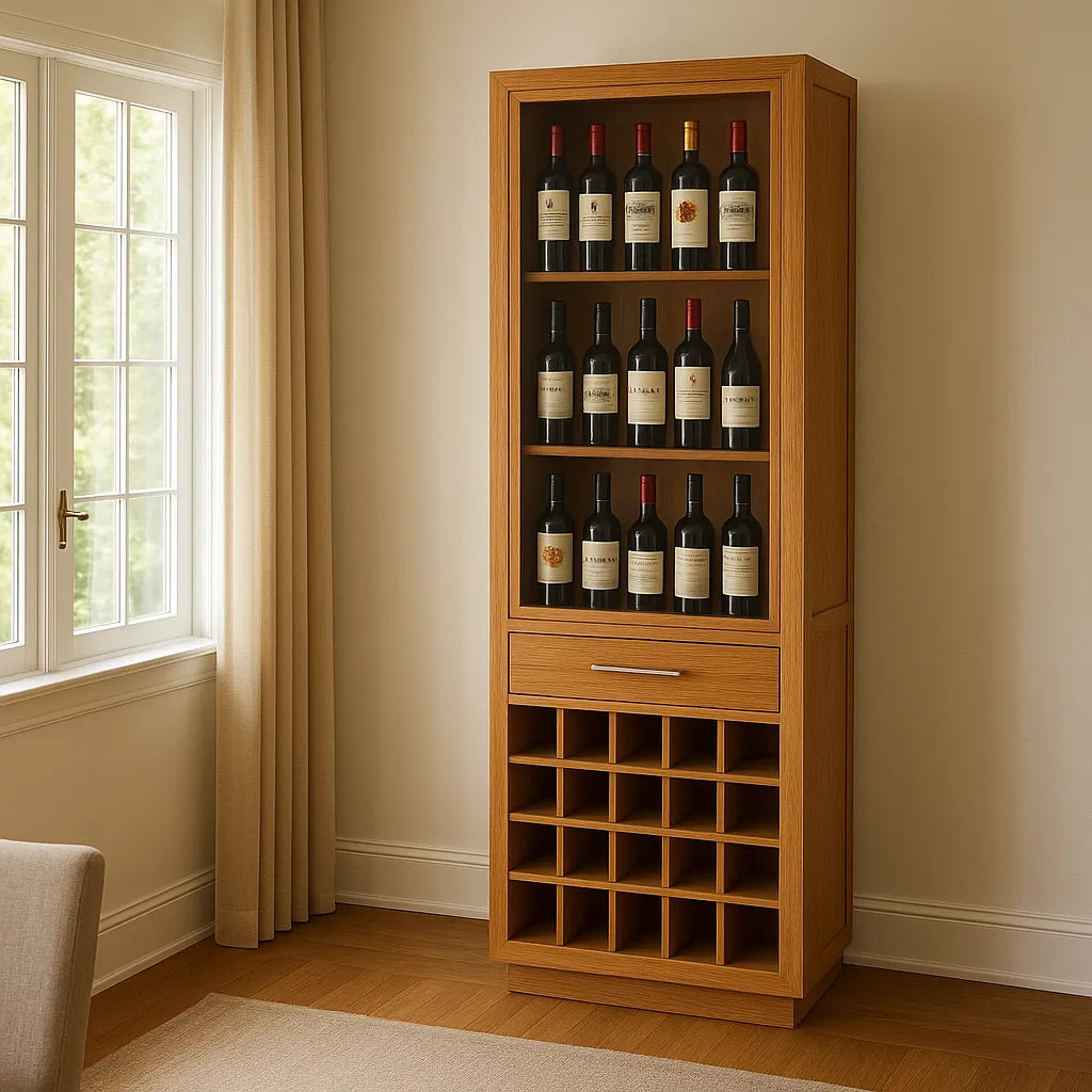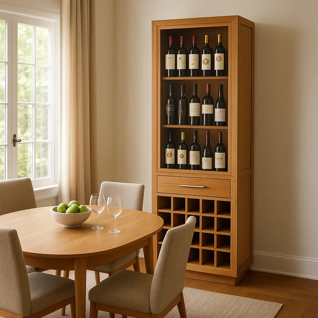 Tall wine cabinet with open cubby, adjustable shelf, and central drawer offers vertical arrangement for bottle and item. The slim frame fits into a kitchen corner, lounge area, or dining room without taking up much floor space. A neutral tone and clean outline allow the cabinet to blend into various interior settings. The open cubby supports visible storage, while the enclosed drawer provides a place for a cork or tool. With a balanced layout, this cabinet brings quiet structure to a compact area.