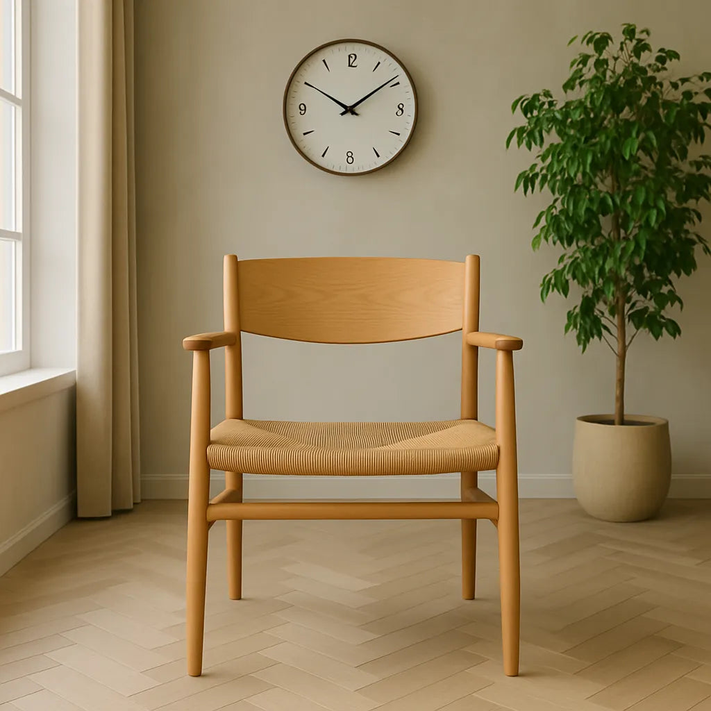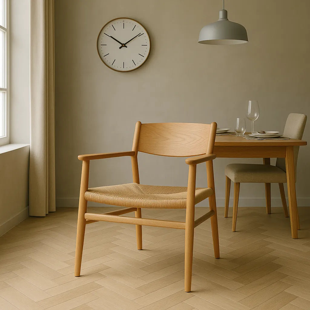 A woven seat armchair with a curved wooden backrest and softly angled armrest offers gentle comfort in a relaxed setting. The handwoven seat introduces natural texture, allowing air flow and quiet support for moments of rest or conversation. Clean lines and a simple frame make the chair suited for a living area, reading nook or dining space. The warm tone and subtle weave add softness to the interior without drawing too much attention. Easy to reposition when needed, the chair holds its form while fitting into a calm, uncluttered environment.