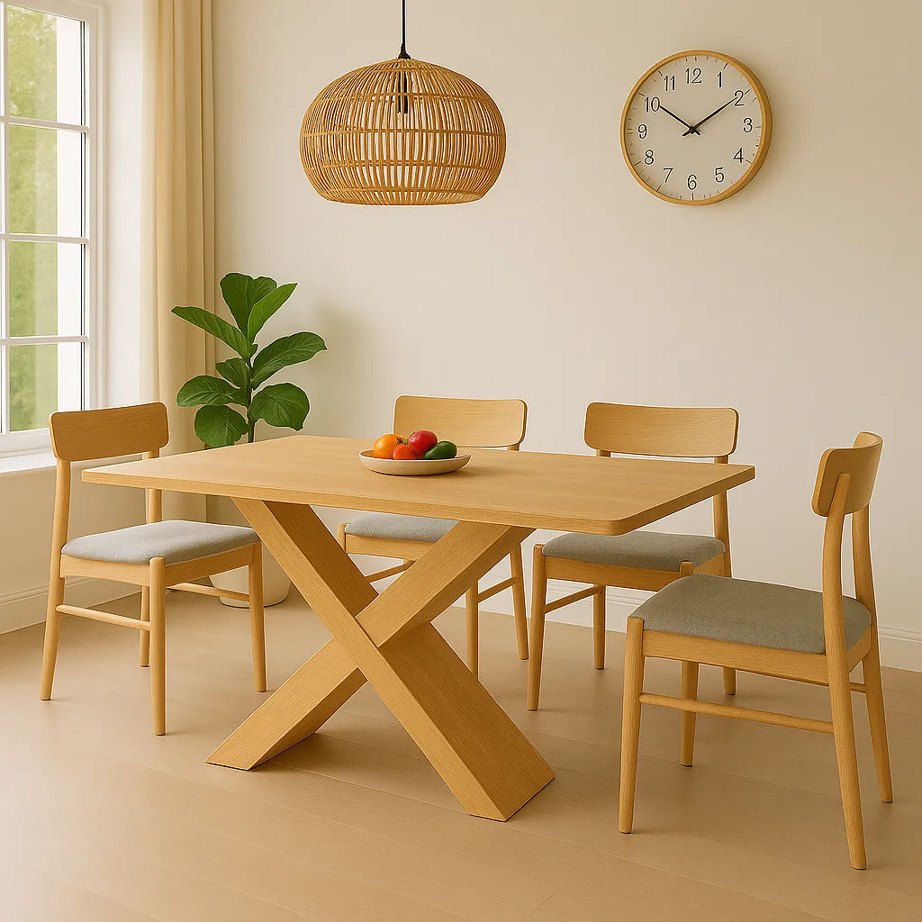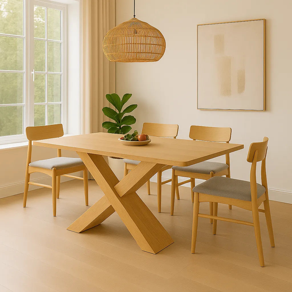 A modern dining space takes form with the X base dining table, defined by a rectangular top and sculpted base crossing at center. The intersecting leg design adds visual rhythm while supporting the overall structure. A smooth surface offers room for daily meals, light work or quiet conversation. The clean outline and natural tone help the table fit into a calm interior setting. Positioned in an open layout or quiet corner, this table supports a balanced flow between function and simplicity.